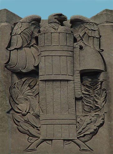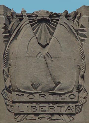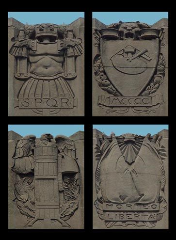 These stone carvings represent four eras in Italy’s history. They begin with The Roman Period, represented by the letters S.P.Q.R. (“The Senate and People of Rome”) and a Roman warrior. The Italian Renaissance bears a carving of the Roman numerals MCCCC (1400), the universally accepted date of the start of the Italian Renaissance, along with a shield decorated with a palette and brushes. Below the two flags in the third carving, Italian Independence of 1870, is the Italian motto for “Death or Liberty”. The Fascist Regime represents the fascist Italian government lead by Benito Mussolini.