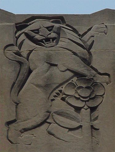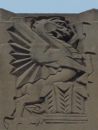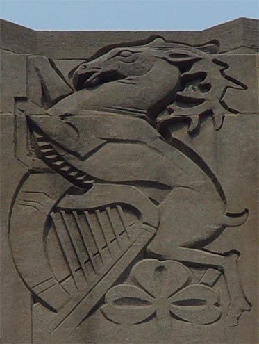 For this series of carvings, Chambellan borrowed motifs from the coats of arms of England, Scotland, Wales and Ireland—the four countries that make up the British Isles. The carvings help publicize the government of Great Britain, the building’s primary tenant at the time. They symbolize what is royally, historically or mythologically significant in each country: Wales is a mighty dragon; England is a lion and large Tudor rose; Scotland is a unicorn and outsized thistle; Ireland is an elegant stag with harp and shamrock.