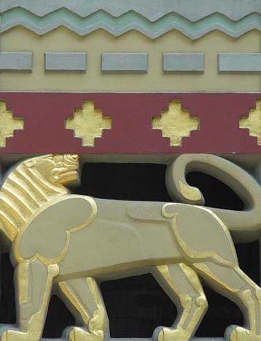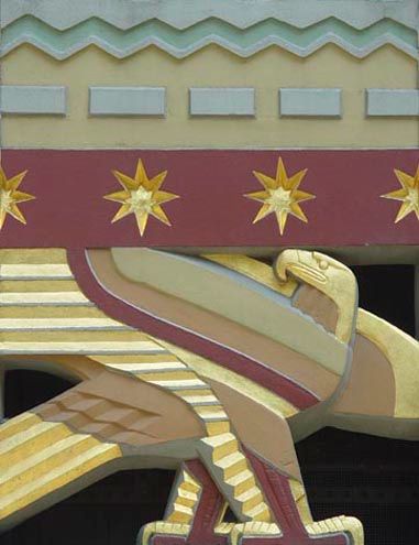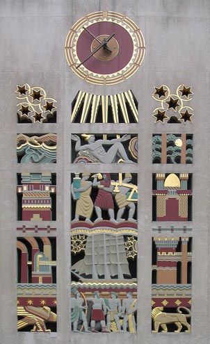 The Story of Mankind is a massive carved limestone screen divided into fifteen small rectangular spaces that Lawrie termed “hieroglyphs”. It was created to symbolize the purpose of the International Building and to chronicle mankind’s progress, starting with the bottom center’s four figures depicting the races of mankind. The sailing ship image above them symbolizes international trade, while other symbols include a Norman tower as pre-industry, a lion as kingdoms of the world, and Mercury as worldwide communication. The clock and rays at the very top represent earth.